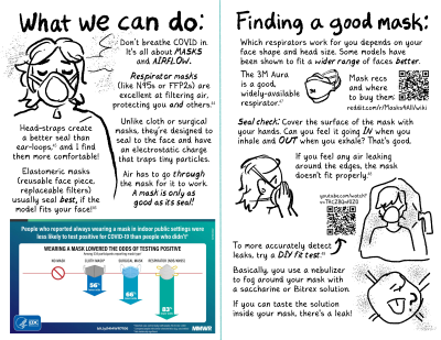 | 44 | Respirator masks are designed to seal to the face and have an electrostatic charge; excellent at protecting you and others | Greenhalgh, Trisha, et al. “Masks and Respirators for Prevention of Respiratory Infections: A State of the Science Review.” Clinical Microbiology Reviews, vol. 37, no. 2, American Society for Microbiology, May 2024, https://doi.org/10.1128/cmr.00124-23. |