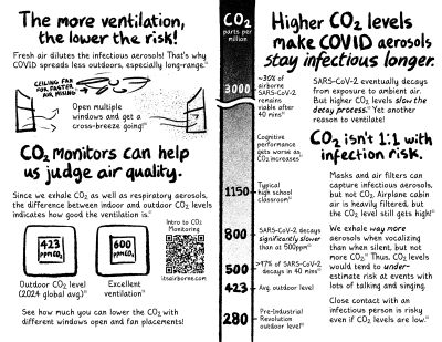 | Estimate ventilation rate with a CO2 monitor | Jimenez, Jose L. "How to quantify the ventilation rate of an indoor space using an affordable CO2 monitor." Something in the Air, 18 Nov 2022. |