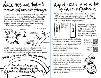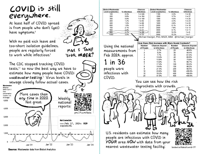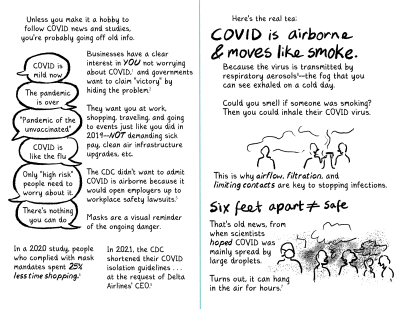Biobot.io - COVID wastewater data that can be filtered by state, giving a more local estimate of how many people currently have COVID. [Note: as of 5/17/24, Biobot no longer shares local wastewater data with the public. Now they share "Respiratory Risk Reports" divided into Northeast, Midwest, South, and West. These reports still contain SARS-CoV-2 copies/mL, which can be converted into regional "% Infectious" estimates via the chart in this zine.